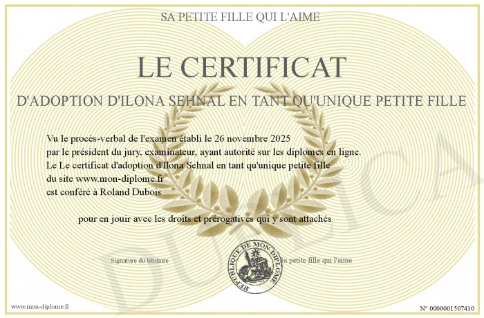 Envoyez par email votre Le certificat d'adoption d'Ilona Sehnal en tant qu'unique petite fille personalisé