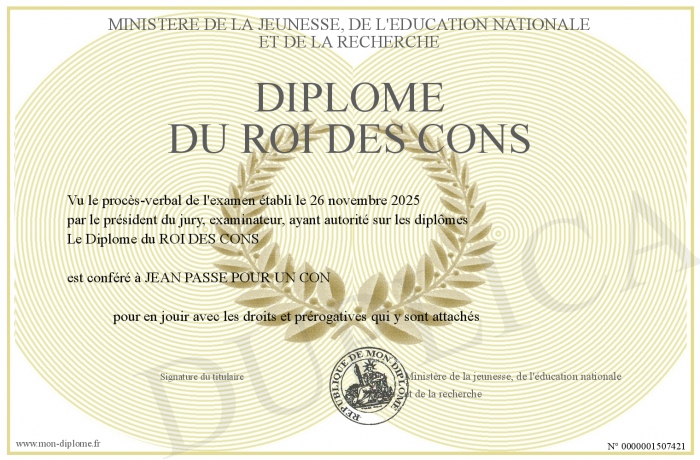 Envoyez par email votre Diplôme du ROI DES CONS personalisé