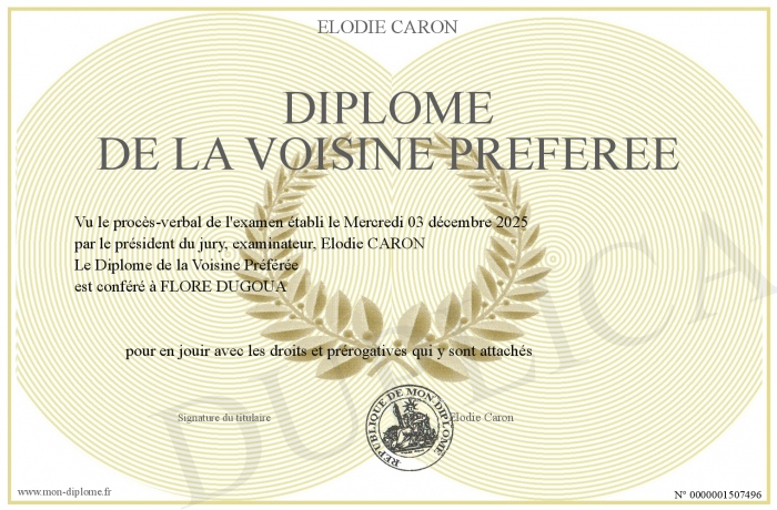 Envoyez par email votre Diplôme de la Voisine Préférée personalisé