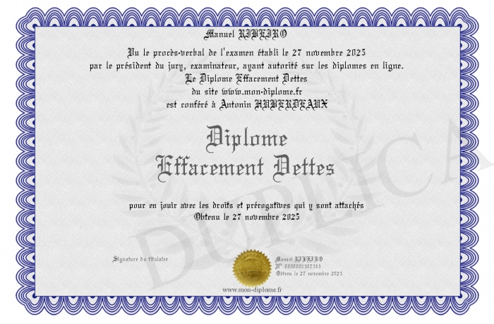 Envoyez par email votre Diplôme Effacement Dettes personalisé