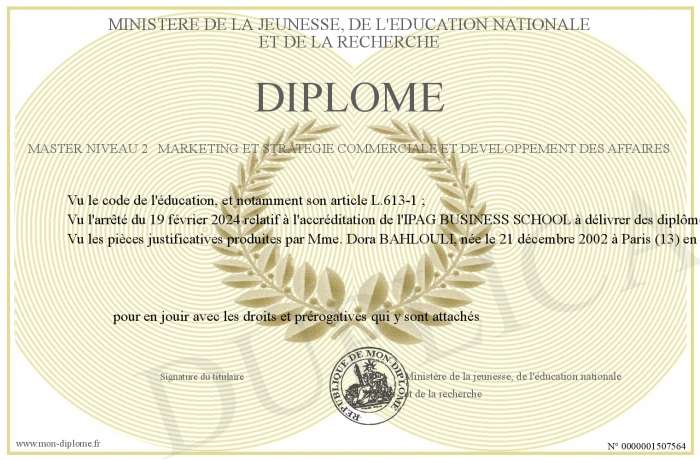 Envoyez par email votre Diplôme Master NIVEAU 2 Marketing et Stratégie commerciale et Développement des affaires personalisé