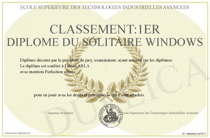Envoyez par email votre Classement:1er Diplome du solitaire windows personalisé