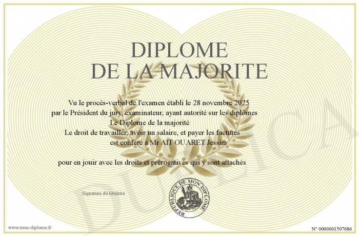 Envoyez par email votre Diplôme de la majorité personalisé