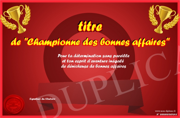 Envoyez par email votre titre de -Championne des bonnes affaires- personalisé