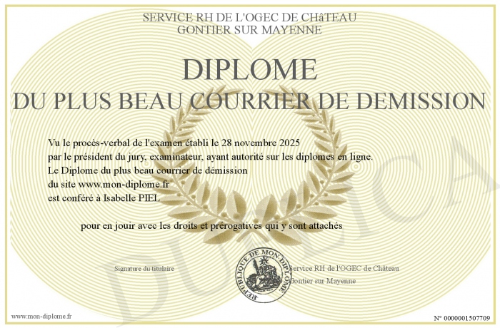 Envoyez par email votre Diplôme du plus beau courrier de démission personalisé