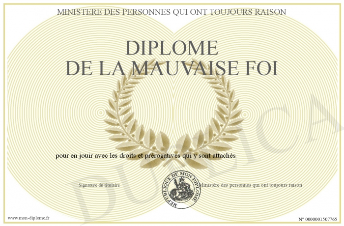 Envoyez par email votre Diplôme de la mauvaise foi personalisé