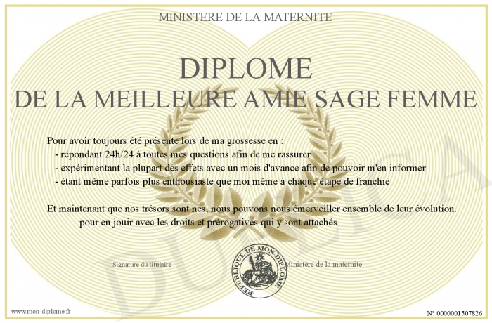 Envoyez par email votre Diplôme de la meilleure amie sage femme personalisé