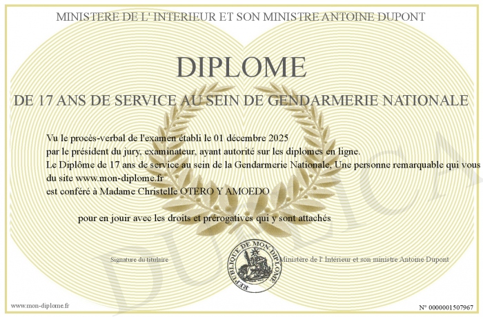 Envoyez par email votre Diplôme de 17 ans de service au sein de Gendarmerie Nationale personalisé