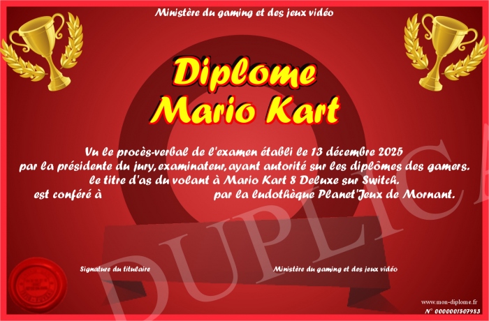 Envoyez par email votre Diplôme Mario Kart personalisé