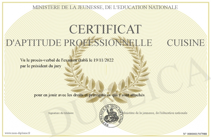 Envoyez par email votre CERTIFICAT D'APTITUDE PROFESSIONNELLE Cuisine personalisé