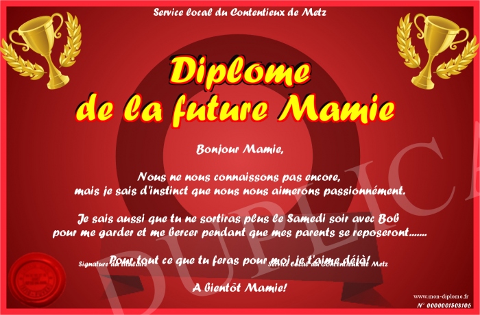 Envoyez par email votre Diplome de la future Mamie personalisé