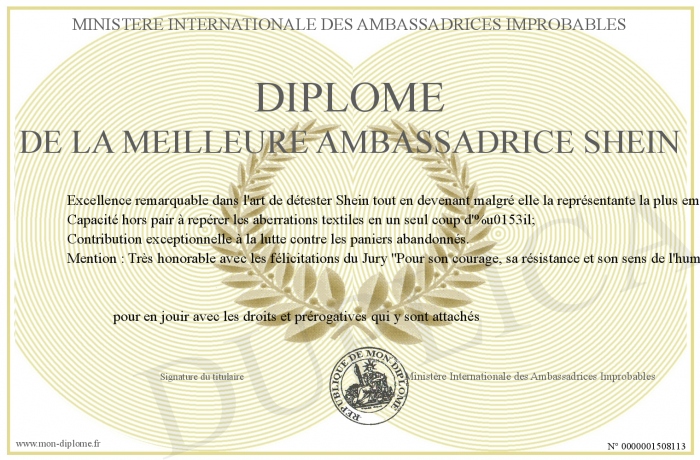 Envoyez par email votre Diplôme de la meilleure ambassadrice Shein personalisé