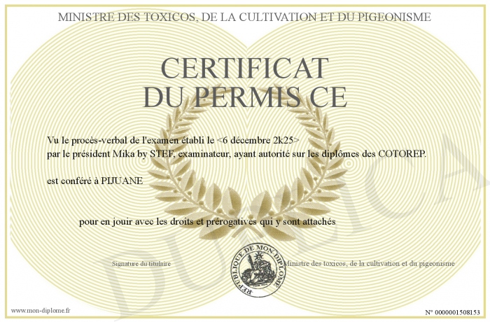 Envoyez par email votre CERTIFICAT DU PERMIS CE personalisé