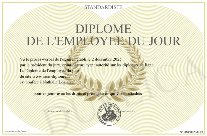 Envoyez par email votre Diplôme de l'employée du jour personalisé