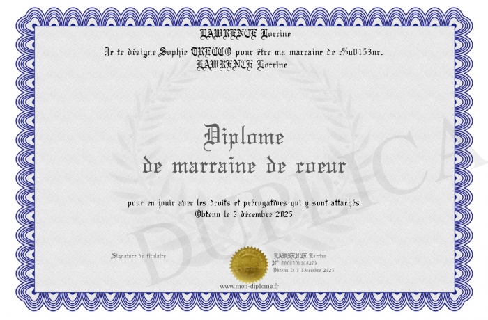 Envoyez par email votre Diplôme de marraine de coeur personalisé