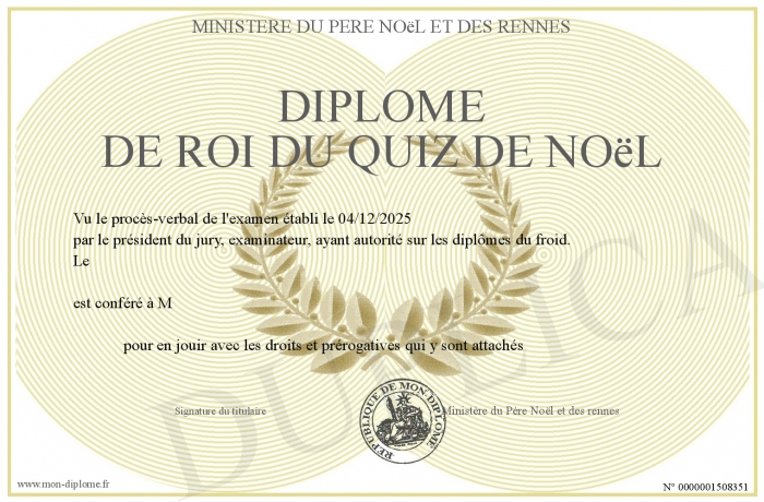 Envoyez par email votre Diplôme de roi du quiz de Noël personalisé