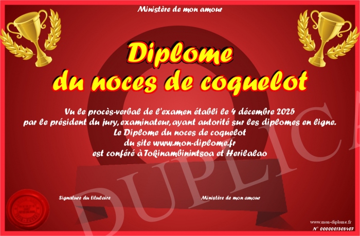 Envoyez par email votre Diplôme du noces de coquelot personalisé