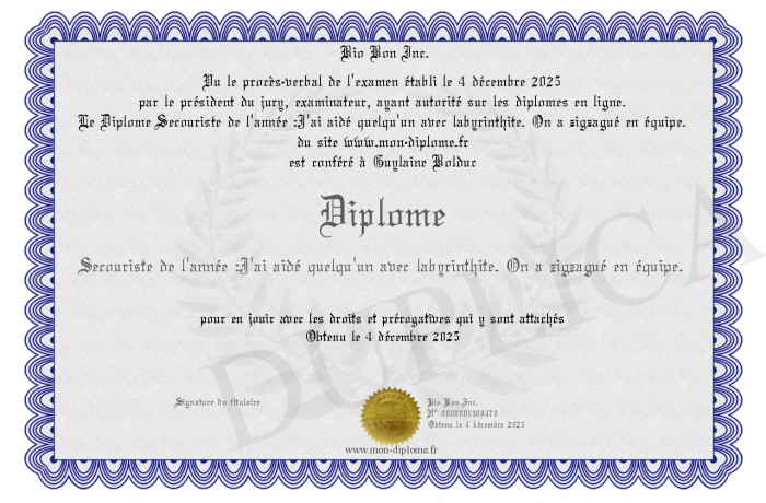 Envoyez par email votre Diplôme Secouriste de l'année :J'ai aidé quelqu'un avec labyrinthite. On a zigzagué en équipe. personalisé