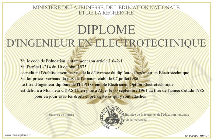 Envoyez par email votre Diplôme d'Ingénieur en Electrotechnique personalisé