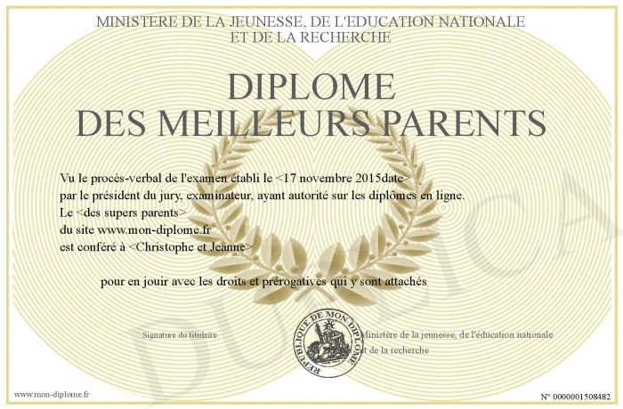 Envoyez par email votre Diplôme des meilleurs parents personalisé