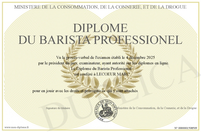 Envoyez par email votre Diplôme du Barista Professionel personalisé