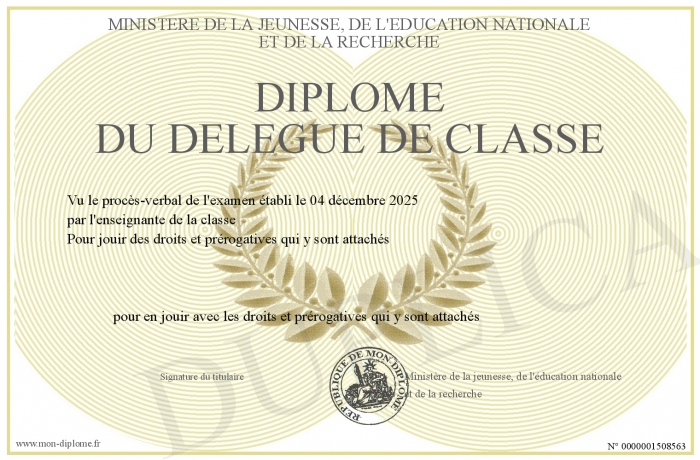 Envoyez par email votre Diplôme du délégué de classe personalisé