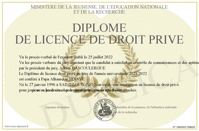 Envoyez par email votre Diplôme de licence de droit privé personalisé