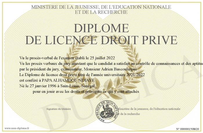 Envoyez par email votre Diplôme de licence droit prive personalisé