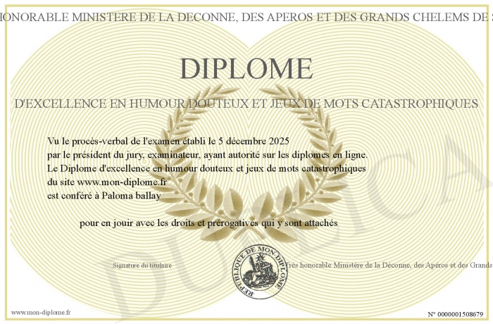 Envoyez par email votre Diplôme d'excellence en humour douteux et jeux de mots catastrophiques personalisé