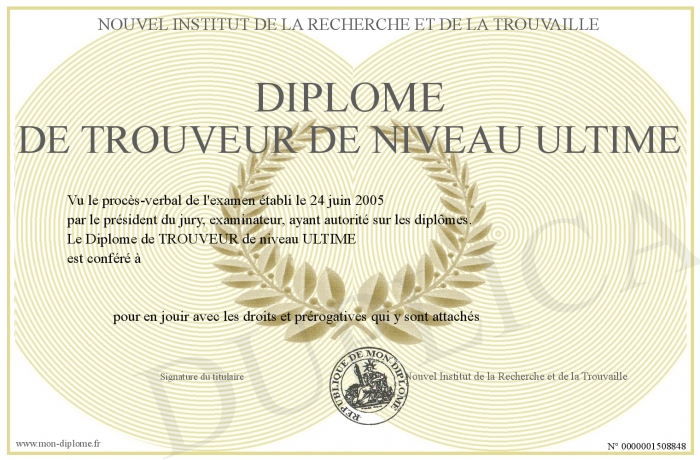 Envoyez par email votre Diplôme de TROUVEUR de niveau ULTIME personalisé