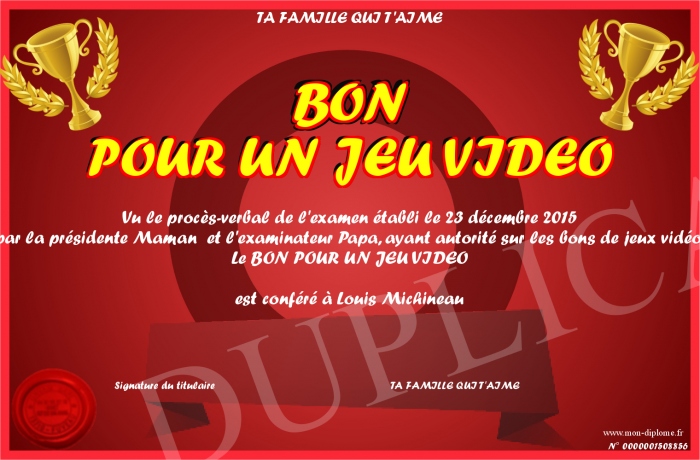 Envoyez par email votre BON POUR UN JEU VIDEO personalisé