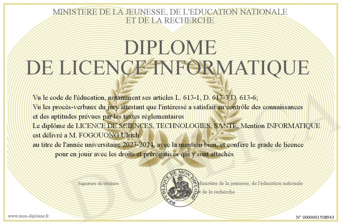 Envoyez par email votre Diplôme de licence informatique personalisé