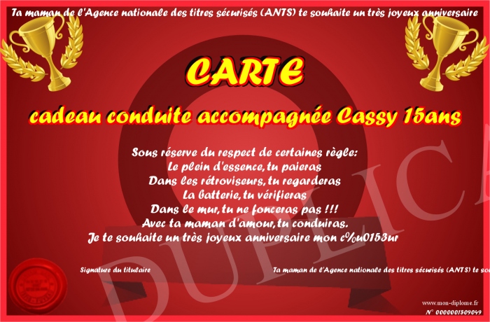Envoyez par email votre CARTE cadeau conduite accompagnée Cassy 15ans personalisé