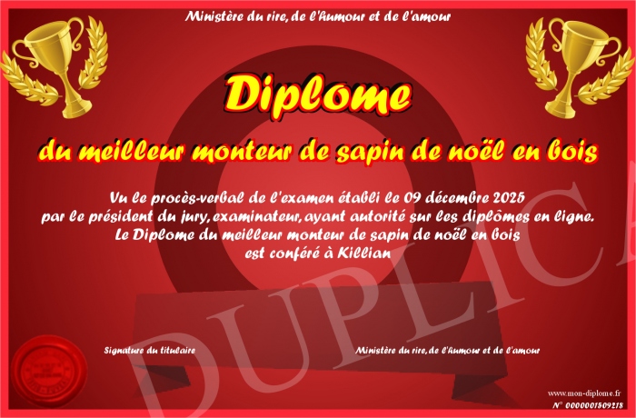 Envoyez par email votre Diplôme du meilleur monteur de sapin de noël en bois personalisé