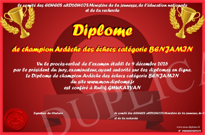 Envoyez par email votre Diplôme de champion Ardèche des échecs catégorie BENJAMIN personalisé