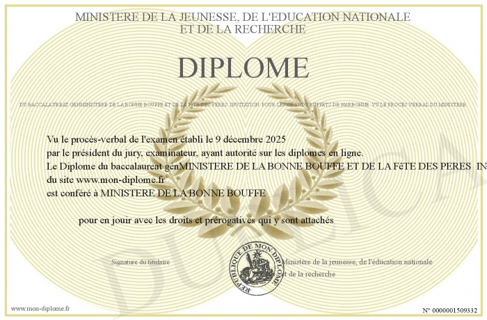 Envoyez par email votre Diplôme du baccalaureat génMINISTERE DE LA BONNE BOUFFE ET DE LA FêTE DES PERES INVITATION POUR LES GRANDS BUFFETS DE NARBONNE Vu le procès verbal du Ministère personalisé