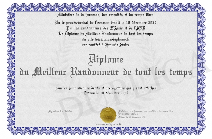 Envoyez par email votre Diplôme du Meilleur Randonneur de tout les temps personalisé