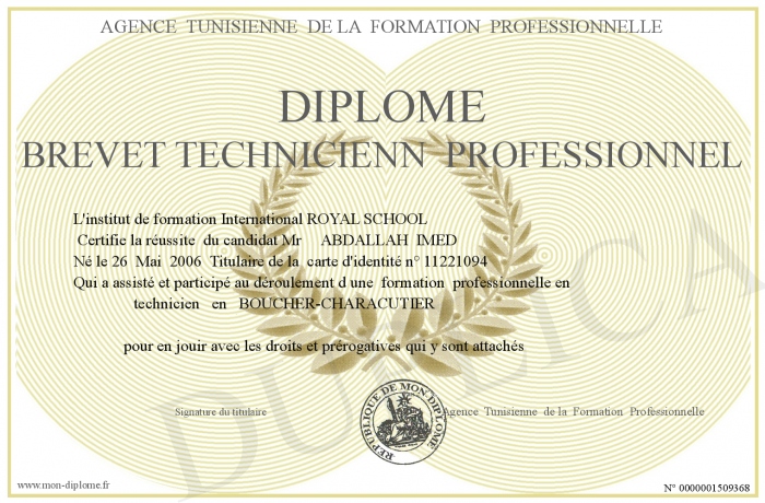 Envoyez par email votre Diplôme BREVET TECHNICIENN PROFESSIONNEL personalisé