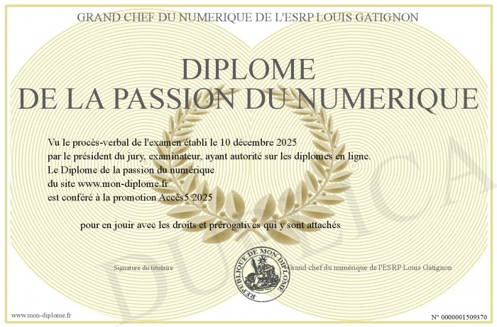 Envoyez par email votre Diplôme de la passion du numérique personalisé