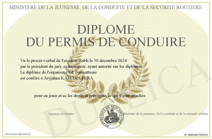 Envoyez par email votre Diplôme du Permis de conduire personalisé