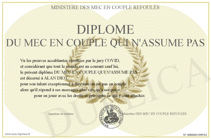 Envoyez par email votre Diplôme DU MEC EN COUPLE QUI N'ASSUME PAS personalisé