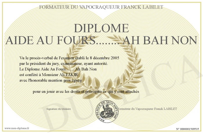 Envoyez par email votre Diplôme Aide Au Fours........ Ah Bah Non personalisé