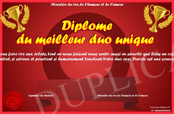 Envoyez par email votre Diplôme du meilleur duo unique personalisé