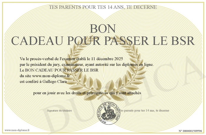 Envoyez par email votre BON CADEAU POUR PASSER LE BSR personalisé