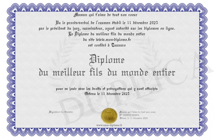 Envoyez par email votre Diplôme du meilleur fils du monde entier personalisé