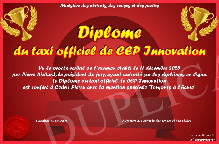 Envoyez par email votre Diplôme du taxi officiel de CEP Innovation personalisé