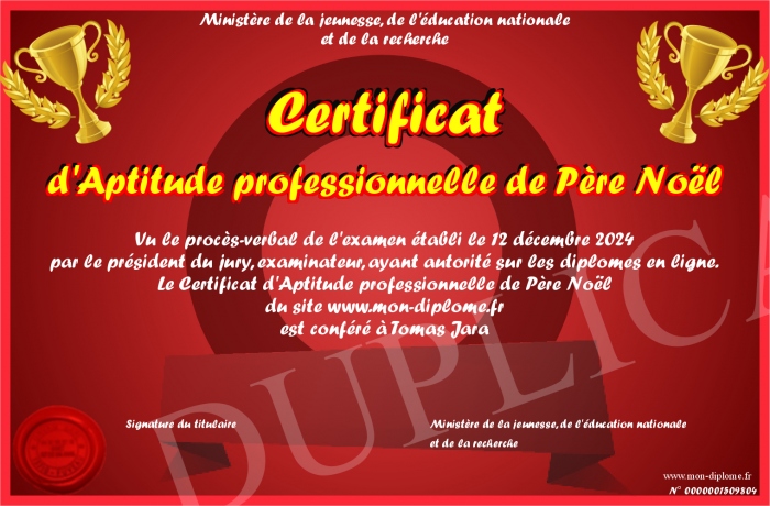 Envoyez par email votre Certificat d'Aptitude professionnelle de Père Noël personalisé