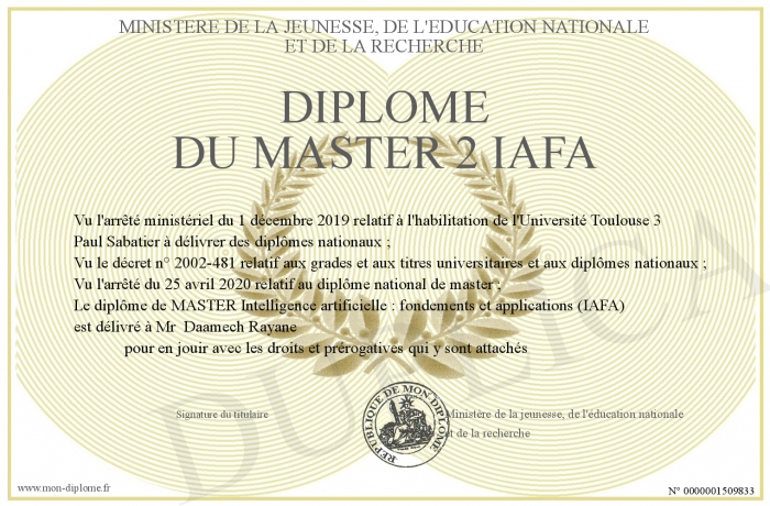 Envoyez par email votre Diplôme du Master 2 IAFA personalisé