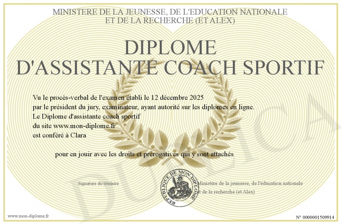 Envoyez par email votre Diplôme d'assistante coach sportif personalisé