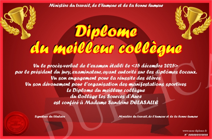 Envoyez par email votre Diplome du meilleur collègue personalisé